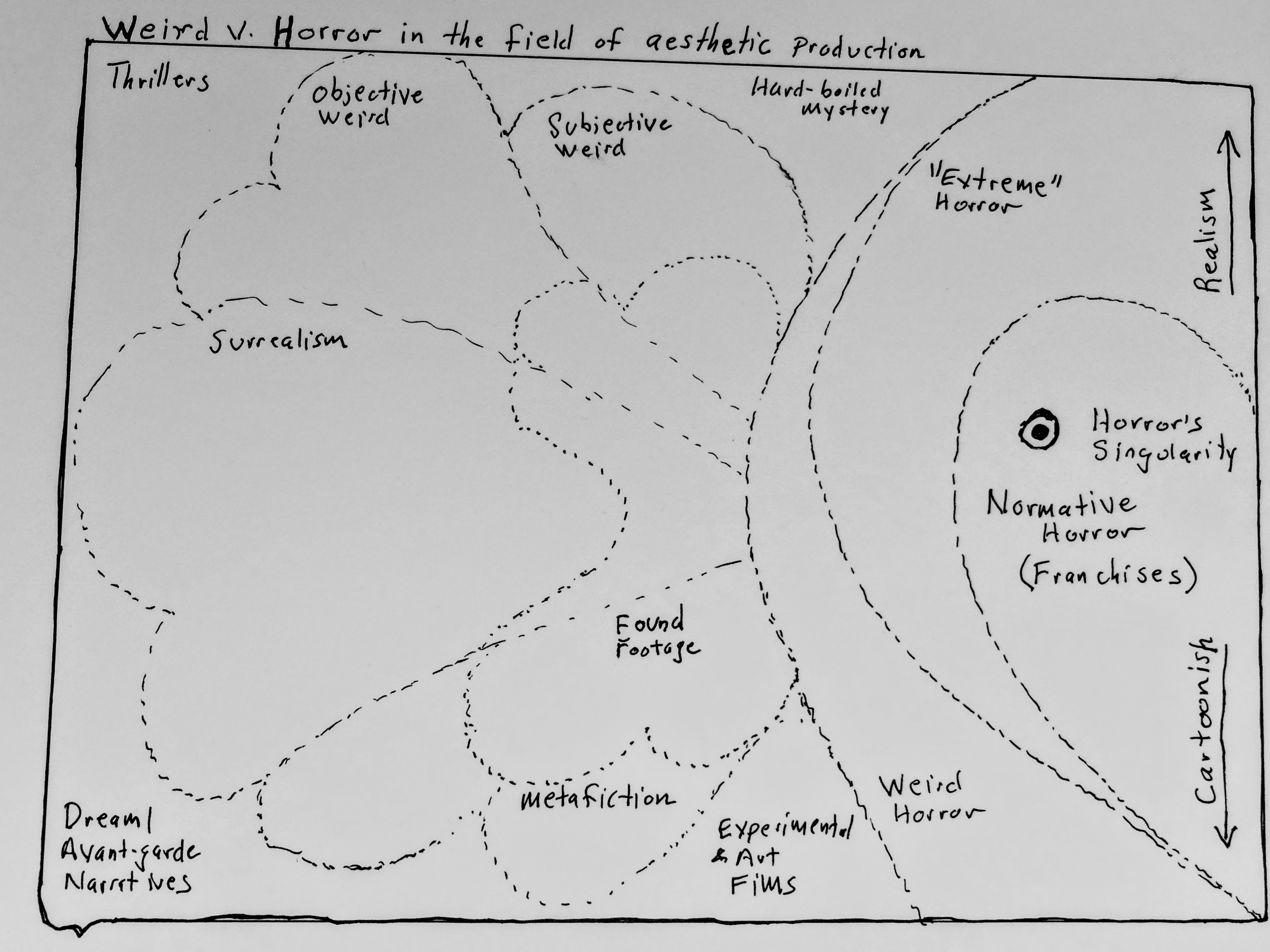The same may be said for contemporary film. Today, the category of “horror” subsumes many films that might better be termed weird, while other very weird films remain uncategorizable. This is particularly true of films in the “found footage” style, which are generally labelled as “horror” by critics who bemoan the genre’s lack of horror. Like all other affects, terror, fear, and abjection are inevitable and important elements in our culture. I am not, in what follows, arguing against the cultural sensation of horror. But I am railing against its use as an umbrella term that obscures more than it reveals. Let horror be horror and let the many fans of horror rejoice; but the stew of shared sensations thickens when we recognize the multiplicity of feelings evoked by popular culture, and that is my goal.